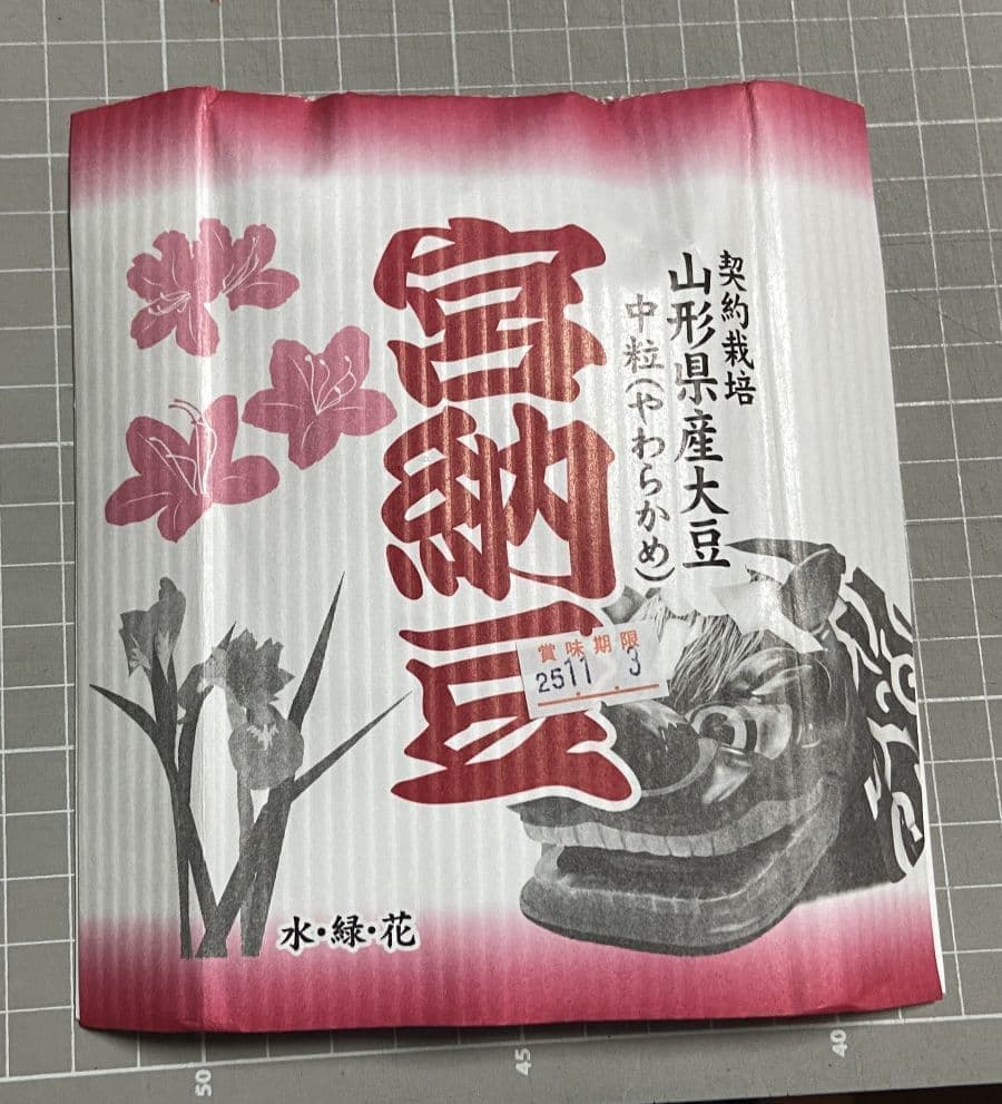 パッケージには長井市のシンボル「あやめ」と代表的神事「黒獅子」が描かれた、郷土愛溢れる中粒納豆です。